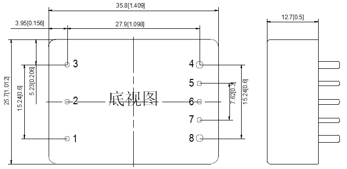 - 引腳 4,8 直徑為 1.5mm(0.06in)其它引腳直徑為 1.0mm(0.04in)引腳長度為 5.0mm±0.5mm(0.2±0.02in)