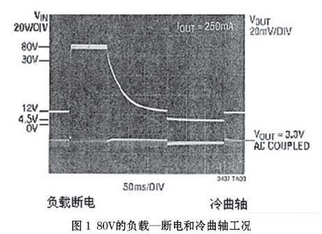 “冷曲軸”(cold crank)段,發(fā)生在汽車發(fā)動(dòng)機(jī)經(jīng)受冷卻或凝固期間,發(fā)動(dòng)機(jī)油變的非常粘滯。因而要求起動(dòng)機(jī)輸出更大的轉(zhuǎn)矩,相繼需要蓄電池提供更大的電流。這一大的電流負(fù)載導(dǎo)致蓄電池/一次母線的電壓降低,甚至低于4V的點(diǎn)火電壓。隨后,又回復(fù)至額定電壓13.8V(圖1)。這在某些應(yīng)用場合,例如發(fā)動(dòng)電機(jī)控制、安全系統(tǒng)和導(dǎo)航系統(tǒng)均不可避免。故要求具有良好調(diào)節(jié)的輸出電壓(一般為3.3V)貫穿“冷曲軸”段,以實(shí)現(xiàn)全過程的無間斷(連續(xù))運(yùn)行。