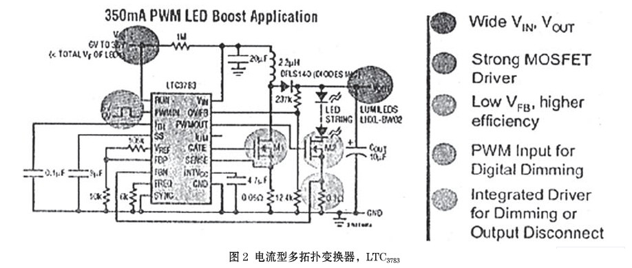 LTC3783是帶恒流PWM調(diào)光的電流型多拓?fù)渥儞Q器(圖2),用于驅(qū)動(dòng)大功率LED燈串。本項(xiàng)專利技術(shù)可提供非??於鴾?zhǔn)確的負(fù)載切換,不會產(chǎn)生瞬時(shí)的欠電壓或過電壓,能數(shù)字式達(dá)到3000∶1的調(diào)光率(100Hz),純色的PWM調(diào)光可確保白色LED和紅綠藍(lán)(RGB) LED的顏色完整性。LTC3783利用模擬控制,容許附加100∶1的調(diào)光比,因人眼對周圍光線的變化很敏感,故這一比率必不可少。該多功能的控制器可用于升壓、降壓、升降壓雙向變換器或反激式(Flyback)變換器,或作為恒流/恒壓的調(diào)節(jié)器。利用MOSFET的通態(tài)電阻(on-resistance)可取消傳感電流的電阻器,并提高了效率。LTC3783芯片的應(yīng)用還包括:高電壓LED陣列和LED背光,以及在電訊、自動(dòng)化與工業(yè)控制系統(tǒng)中的調(diào)節(jié)器。
