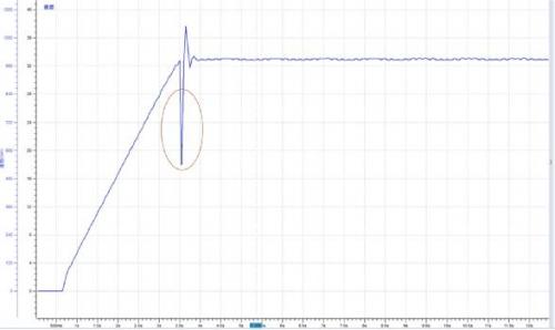 某使用PWM波形驅(qū)動(dòng)的直流電機(jī)在加速過程中存在微小抖動(dòng)情況,觀察電機(jī)轉(zhuǎn)速波形如圖3所示,開始加速后大約在3.6秒轉(zhuǎn)速出現(xiàn)一個(gè)下拉動(dòng)作。電機(jī)PWM調(diào)速原理是通過改變接通脈沖的寬度,使直流電機(jī)電樞上電壓的占空比改變,從而改變電樞電壓的平均值,控制電機(jī)的轉(zhuǎn)速。因此基本可以確定這個(gè)轉(zhuǎn)速下拉動(dòng)作是由于PWM波占空比出現(xiàn)異常引起的。