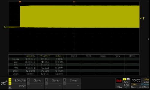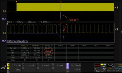 定位到占空比異常位置后,開啟示波器縮放模式下ZOOM多窗口顯示功能,對(duì)信號(hào)進(jìn)行局部放大,如圖6所示,可以清晰的看到占空比異常的細(xì)節(jié),同時(shí)開啟對(duì)ZOOM1窗口數(shù)據(jù)的測(cè)量和統(tǒng)計(jì),可以看到占空比從正常的59.62%變?yōu)?.99%左右。