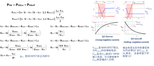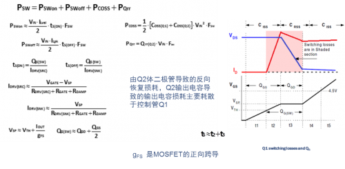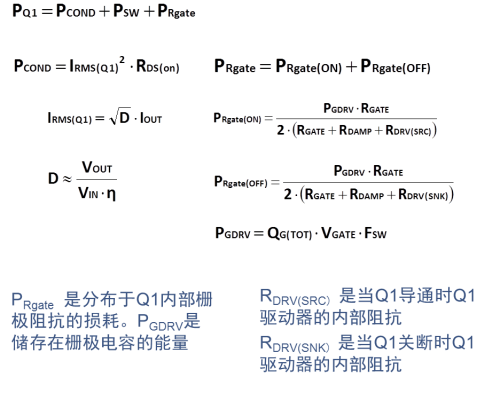 對于高頻應(yīng)用(>MHz),控制管Q1的選用應(yīng)針對降低開關(guān)損耗進行優(yōu)化。Q1損耗的計算公式如下: