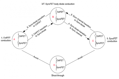 狀態(tài)C:同步管導通,電感儲能通過同步管放電,傳送到輸出端。
