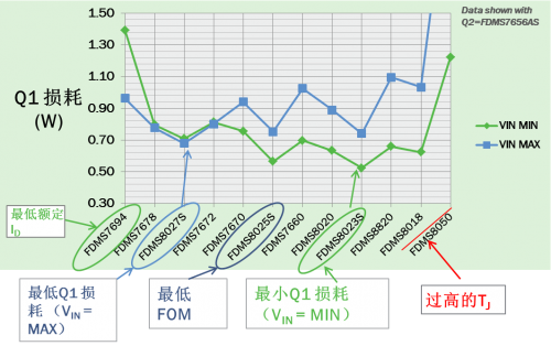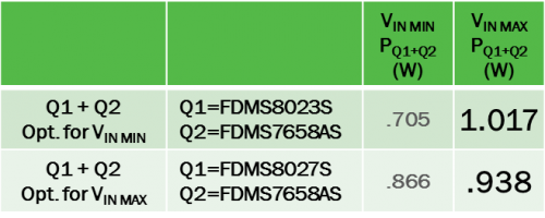 為優(yōu)化轉(zhuǎn)換器能效,首先根據(jù)VIN選擇損耗最小的Q1,然后選擇產(chǎn)生損耗最小的Q2。本例中, 無論VIN最小或最大,最佳的Q2是相同的,都為FDMS7658AS(但并不總是如此,特別是具有寬VIN范圍或高FSW時)。
