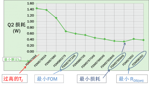對于Q2,VIN= VINMAX時損耗最大。圖3所示的12個器件中,F(xiàn)DMS7656AS有最低的最大損耗。但由于Q2 寄生參數(shù)會影響Q1的 開關(guān)損耗, 最小Q2 損耗通常并不意味著最佳的總能效。必須比較Q1及Q2的總功耗來找到最佳的Q2以實現(xiàn)最高能效。