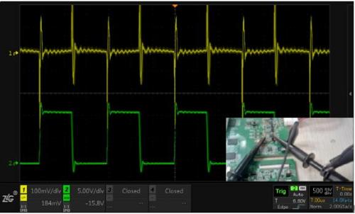 圖3 CH1使用夾子測(cè)量電源輸出,CH2使用夾子測(cè)量電感,單點(diǎn)接地