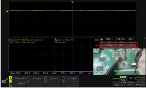 注:通道1信號(hào)幅度雖然非常小,但通過(guò)FFT分析還是可以定位出600K頻點(diǎn)的干擾。