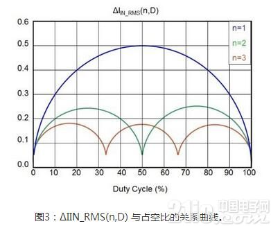 其中,n為相數(shù),L為輸出電感,F(xiàn)s為開關(guān)頻率,k(n,D)=floor(n,D),floor函數(shù)的返回值為小于或等于輸入值的最大整數(shù)。圖3顯示了ΔIIN_RMS(n,D) 與占空比的關(guān)系曲線。