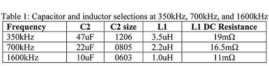 表格1:頻率分別為350kHz, 700kHz,和1600 kHz時(shí)的電容器和感應(yīng)器選項(xiàng) |