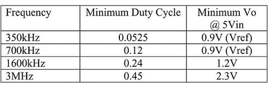 上面例子中的TPS54317型轉(zhuǎn)換器任務(wù)周期為0.36 (1.8V/5.0V),最小啟動(dòng)時(shí)間為數(shù)據(jù)表中所示的150ns(最大值)。可控制脈寬的限制產(chǎn)生了可獲得的最小任務(wù)周期,根據(jù)等式3可以很容易算出來(lái)。一旦知道了最小任務(wù)周期,就可以計(jì)算出最低可獲取輸出電壓,如等式4和表格2中所示。最低輸出電壓也受到轉(zhuǎn)換器參考電壓限制,TPS54317的最低輸出電壓為0.9V。