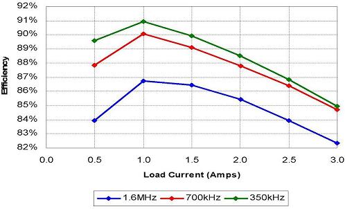 我們來(lái)對(duì)比一下這三種頻率分別為的350, 700和1600 kHz的電源的利弊。三種方案都使用頻率1.6 MHz、低電壓、帶MOSFET的TPS54317型3 A同步降壓DC/DC轉(zhuǎn)換器作為調(diào)壓器。