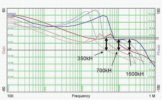 圖3:批量為350 kHz, 700 kHz和1600 kHz.時(shí)的波德圖 |