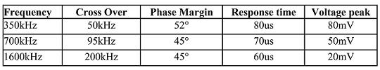 瞬間反應(yīng)是衡量電源性能等級(jí)的一個(gè)很好的指標(biāo)。我們利用每個(gè)電源的在更高轉(zhuǎn)換頻率下的波德圖來(lái)進(jìn)行對(duì)比。如圖3所示,每個(gè)電源的相位補(bǔ)角都在45度到55度之間,這是一個(gè)抑制效果不錯(cuò)的瞬間反應(yīng)。