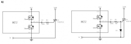 使用正電流驅(qū)動(dòng)SCR很容易。如果SCR的陰極連接VSS端子,如圖1a所示,當(dāng)控制電路(通常是微控制器)的輸出引腳置高電平時(shí),控制電路向SCR柵極輸出電流。