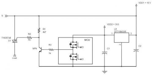基于這些原因,圖2的電路示意圖整合了負(fù)電源和正穩(wěn)壓器的雙重優(yōu)點(diǎn)。在這個(gè)示意圖中,ST715M33R是最大靜態(tài)電流5.5 µA的正穩(wěn)壓器,與“負(fù)”15V輸出相連,為微控制器提供3.3V電源電壓,其中,-15V電壓是基于VIPer06的降壓升壓轉(zhuǎn)換器或反激式轉(zhuǎn)換器的輸出 (參見意法半導(dǎo)體的AN4564應(yīng)用筆記)。T1635T-8是一個(gè)T系列三象限雙向可控硅,微控制器能夠吸收T1635T-8的電流。