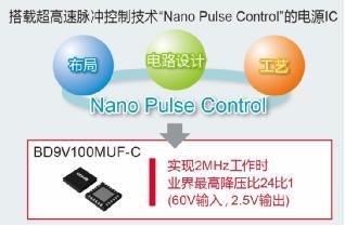 新產(chǎn)品“BD9V100MUF-C”搭載了利用超高速脈沖控制電路和高耐壓BiCDMOS工藝技術(shù)優(yōu)勢等開發(fā)而成的超高速脈沖控制技術(shù)“Nano Pulse Control”,實現(xiàn)了電源IC的世界最小※開關(guān)導(dǎo)通時間9ns(開關(guān)導(dǎo)通時間是電源IC的控制脈沖寬度,N是10的負(fù)9次冪),從而實現(xiàn)了業(yè)界最高降壓比。