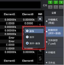 第三,數(shù)據(jù)類型里有“數(shù)值”、“波形”、“數(shù)值+波形”三個選項,代表存儲的數(shù)據(jù)類型,點擊“數(shù)值”則表示只記錄數(shù)值數(shù)據(jù),點擊“波形”則表示只記錄波形數(shù)據(jù),點擊“數(shù)值+波形”則同時記錄數(shù)值和波形數(shù)據(jù);