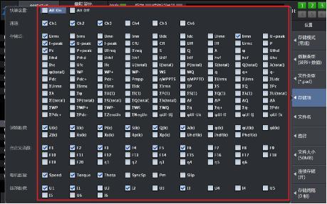 第五,存儲項是設置中最關鍵的一步,點開存儲項菜單后,會看到功率分析儀所能分析記錄的所有數(shù)據(jù),我們根據(jù)自己的需要進行勾選對應通道和參數(shù),只有完成存儲項的設置,才能記錄對應的數(shù)據(jù);