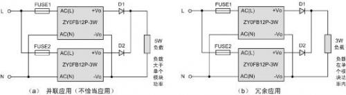 如上圖電路(a)所示,負(fù)載需5W功率,超出單個(gè)模塊的帶載能力,則其中一個(gè)模塊可能存在超負(fù)荷使用的情況。對(duì)于此種應(yīng)用,需使用單個(gè)大于5W功率的模塊,比如ZY0JGB12P-10W。而電路(b)則不然,每個(gè)模塊的功率均能滿足負(fù)載的需要,此時(shí)屬于冗余設(shè)計(jì)。