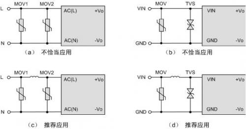 電源模塊體積小,在EMC要求比較高的場(chǎng)合,需要增加額外的浪涌防護(hù)電路,以提升系統(tǒng)EMC性能。如圖1所示,為提高輸入級(jí)的浪涌防護(hù)能力,在外圍增加了壓敏電阻和TVS管。但圖中的電路(a)、(b)原目的是想實(shí)現(xiàn)兩級(jí)防護(hù),但可能適得其反。如果(a)中MOV2的壓敏電壓和通流能力比MOV1低,在強(qiáng)干擾場(chǎng)合,MOV2可能無(wú)法承受浪涌沖擊而提前損壞,導(dǎo)致整個(gè)系統(tǒng)癱瘓。同樣的,電路(b),由于TVS響應(yīng)速度比MOV快,往往是MOV未起作用,而TVS過(guò)早損壞。