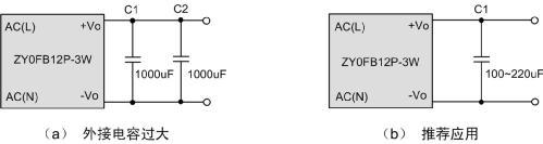 如圖2中的電路(a)所示,一個(gè)3W的模塊,輸出使用了2000uF的電容,而通過(guò)查閱產(chǎn)品手冊(cè)了解到,模塊建議最大輸出電容為800uF。輸出電容過(guò)大可能導(dǎo)致啟動(dòng)不良,而對(duì)于不帶短路保護(hù)的微功率DC-DC模塊,輸出電容過(guò)大甚至可能導(dǎo)致模塊永久損壞。