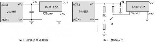 因此推薦使用電路(b),外置簡(jiǎn)單的欠壓鎖定,使24V模塊輸出電壓建立到預(yù)置值后再啟動(dòng)LM2576等外接開(kāi)關(guān)電源芯片,可以很大程度上避免啟動(dòng)不良問(wèn)題。