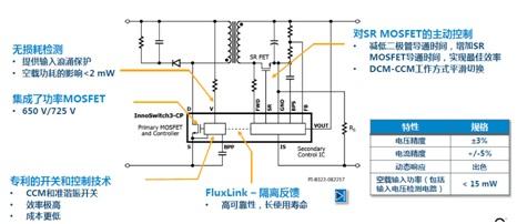 開關(guān)電源分為隔離與非隔離兩種形式,對于中小功率的應(yīng)用,常用的隔離電源拓?fù)浣Y(jié)構(gòu)有正激式和反激式。反激式指在變壓器原邊功率開關(guān)管導(dǎo)通時副邊整流管截止,變壓器儲能。原邊開關(guān)管截止時,副邊整流管開始導(dǎo)通,能量釋放到負(fù)載,周而復(fù)始的開關(guān)工作。反激式電源結(jié)構(gòu)簡單,省掉了一個和變壓器體積大小差不多的電感,因此在中小功率電源中得到廣泛的應(yīng)用。從控制方式來看,InnoSwitch3系列產(chǎn)品初次級之間采用數(shù)字反饋的FluxLink技術(shù)進(jìn)行反饋信息的傳輸,對初次級的開關(guān)實(shí)現(xiàn)精確的時序控制,可以實(shí)現(xiàn)非常高的效率,同時其動態(tài)響應(yīng)特性極佳,而且輸出紋波很小。其次級檢測輸出電壓電流的控制方式使得該系列產(chǎn)品可以輸出高達(dá)65W的輸出功率,如果采用前級的功率因素校正電路,甚至可以輸出100W的輸出功率。。