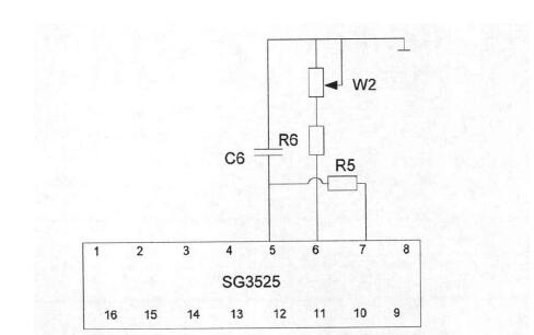 本文設(shè)計(jì)的模塊控制與驅(qū)動(dòng)模塊,工作頻率是由芯片的腳、腳和腳外接的電阻與電容來確定。如圖所示,其中電阻和滑動(dòng)變阻器組成,電容即為,為。根據(jù)計(jì)算公式可以知道